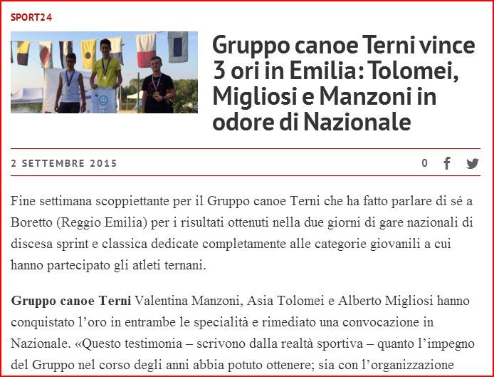 Gruppo canoe Terni vince 3 ori in Emilia: Tolomei, Migliosi e Manzoni in odore di Nazionale